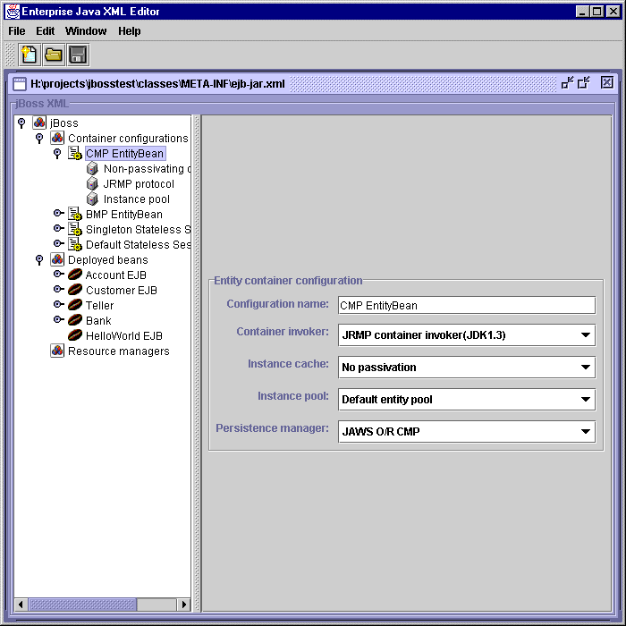 Once you have created the EJB 1.1 XML descriptor for your beans, either by manual editing of the ejb-jar.xml file, or by using the EJB 1.1 support provided in the EJX editor, it is time to add the jBoss specific configuration information. This is done by opening the ejb-jar.xml file as a jBoss configuration file. This will load the information in ejb-jar.xml, and also construct a GUI where additional settings may be made. These additional settings will be stored in jboss.xml when you select Save in the GUI.
