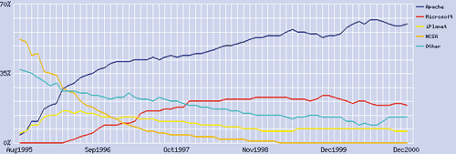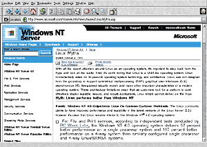 Но под штандарты с изображением пингвина (талисмана ОС Linux) становятся коммерческие компании. В 1992 г. основана немецкая фирма SuSE, занявшаяся разработкой ПО в рамках проекта Open Source (к 2000 г. SuSE Linux станет наиболее распространенным дистрибутивом в Европе). В 1994 г. в США организована компания Caldera, выпустившая свой дистрибутив Linux. А в 1995 г. возникла Red Hat Software, Inc. (на настоящий момент, по различным оценкам, более 60% пользователей Linux установили на свои машины именно Red Hat Linux). К середине 90-х гг. усилиями компаний и активных пользователей Linux приобретает заметный вес в области поддержки Web-серверов. Более того, его "натиск" на область обслуживания Internet-соединений становится чрезвычайно агрессивным. Если в августе 1995 г. на долю Linux приходится около 5% активных серверов в Сети, то уже через год этот показатель достигает 40%. В большой степени секрет кроется в том, что в стандартный комплект поставки Linux входит бесплатный Web-сервер Apache - вполне конкурентоспособный по сравнению даже с Microsoft IIS 2000 г. выпуска, стоящего весьма немалых денег. Таким образом, теперь каждая перманентно подключенная к Internet машина с установленной на ней версией Linux способна работать в режиме Web-сервера. Итог: обслуживание Сети переходит в вотчину некоммерческих систем. По оценкам, на настоящий момент программные Web-серверы Microsoft установлены всего лишь на 20% узлов Internet. Классическая страничка под названием Linux Myths от Microsoft. Обратите внимание: сравнений с Windows 95 не проводится - только с Windows NT. Linux, таким образом, рассматривается, в первую очередь, как серверная, а не пользовательская система. А вот что касается пользовательского интерфейса, графики и совместимости с дополнительным железом, то тут в середине 90-х гг. Linux оказывается в очевидном проигрыше. Поставляющаяся с ним графическая система X Window не слишком мощна. Достаточно сказать, что программная поддержка антиалиасинга (сглаживания линий при масштабировании, например, стандартных шрифтов) включена в X Window только лишь в... 2000 г. И хотя именно Red Hat Linux 4.1 использовался для создания спецэффектов при съемках фильма "Титаник", успехи Windows в области графического представления данных на пользовательском уровне остаются в середине 90-х гг. непревзойденными. Такое положение дел, правда, не мешает спать поклонникам Linux. Как, впрочем, не повергает их в шок и необходимость настройки всех важнейших параметров системы исключительно из командной строки либо посредством редактирования конфигурационных файлов. Зато любые изменения в системе оказываются вполне очевидными. Но для специалиста. Вообще, средний уровень пользователей Linux как программистов и системщиков остается существенно выше среднего уровня приверженцев Windows. Первым приходится самостоятельно разбираться в обширной документации, работать с кодами программ, писать управляющие скрипты. Вторые обходятся рисованными кнопками, ползунками и переключателями, а также наслаждаются преимуществами системы Plug'n'Play. Зарождается жесткое идеологизированное противостояние приверженцев двух систем. Эпизод 3. Оперативный просторВ 1998 г. разворачивается настоящий бум, названный в прессе "Linux Hype". Крупные корпорации валом валят в мир свободного ПО, на ходу раскрывая бумажники. 29 сентября Intel, Netscape Communications и пара более мелких фирм инвестируют миллионы долларов в Red Hat. Число пользователей Linux в мире до