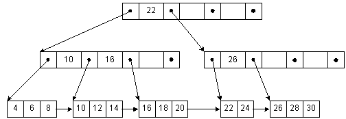 На рис. 4-4 представлено Б+-дерево. Все ключи хранятся в листьях, там же хранится и информационная часть узла. Во внутренних узлах хранятся копии ключей - они помогают искать нужный лист. У указателей смысл немножко не такой, как при работе с обычными Б-деревьями. Левый указатель ведет к ключам, которые меньше заданного значения, правый - ключам, которые больше или равны (GE). Например, к ключам, меньшим 22, ведет левый указатель, а к ключам от 23 и выше ведет правый. Обратите внимание на то, что ключ 22 повторяется в листе, где хранятся соответствующие ему данные. Во время вставки и удаления необходимо аккуратно работать с родительскими узлами. Когда модифицируются первый ключ в листе, дерево проходится от листа к корню. Последний из GE-указателей, найденный при спуске по дереву, и является тем, который потребуется модифицировать, чтобы отразить новое значение ключа. Поскльку все ключи повторяются в листьях, мы можем связать их для последовательного доступа.