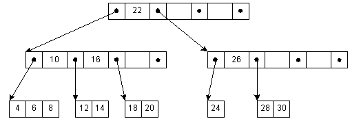 Cтруктуры данных. Хранение информации.Б-деревья.Словари для очень больших файлов располагаются, как правило, во вторичной памяти, такой, как диск. Словарь представляет собой индекс исходного файла и содержит ключи и адреса записей в нем. Для реализации словаря мы могли бы использовать красно-черные деревья, заменив указатели на смещения от начала индексного файла, и использовать обычный произвольный доступ для узлов дерева. Однако, каждый переход по дереву означает обращение к диску и, значит, обходится достаточно дорого. Напомню, что операция доступа к диску означает посекторный обмен; типичный размер сектора - 256 байтов. Мы можем уравнять размер узла с размером сектора и сгруппировать вместе несколько ключей в каждом узле, чтобы уменьшить количество операций обмена. В этом, собственно, и состоит идея Б-деревьев. Они хорошо описаны в книжках Кнута[1998] и Кормена[1990]. О Б+-деревьях почитайте в книжке Ахо[1983]. Теория.Б-деревьяа рис. 4-3 представлено Б-дерево с 3 ключами на узел. Ключи в внутреннем узле окружены указателями или смещениями записей, отсылающими к ключам, которые либо все больше, либо все меньше окруженного ключа. Например, все ключи, меньшие 22, адресуются левой ссылкой, все большие - правой. Для простоты здесь не показаны адреса записей, связанные с каждым ключом.